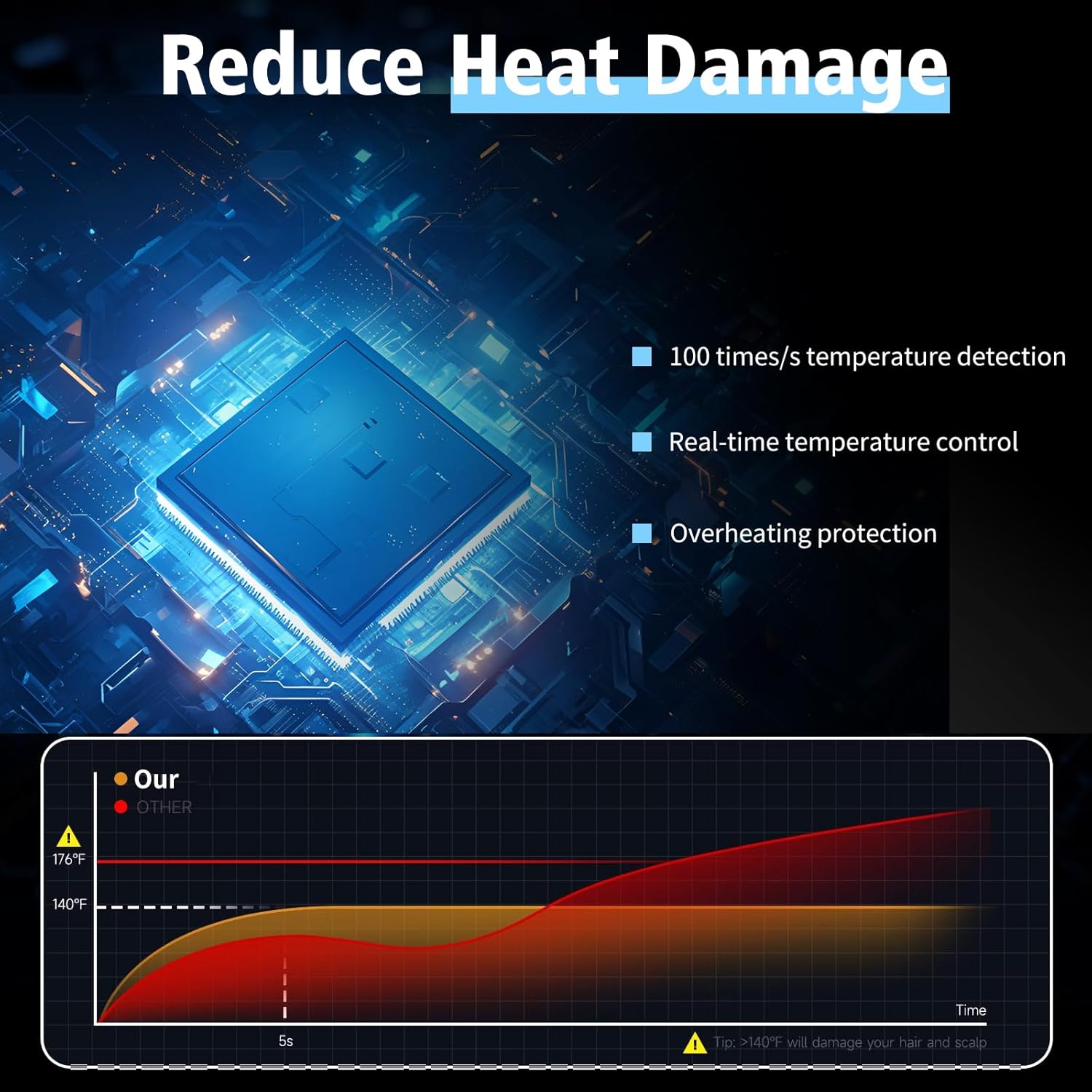 - Protect Hair from Heat Damage – Built-in temperature control sensors monitor heat levels 100 times per second to ensure consistent, even airflow—preventing overheating and protecting hair from heat damage